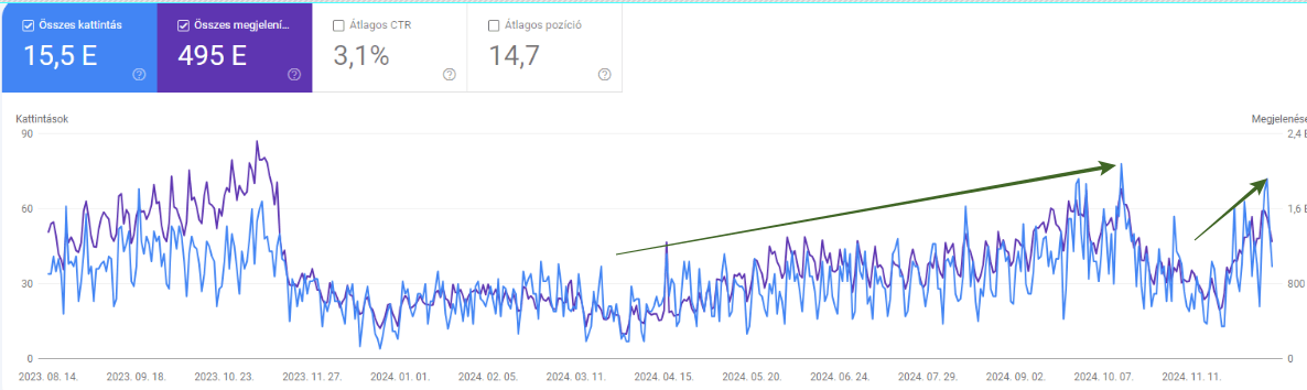Az érdemi SEO munkát 2024 januárjában kezdtük el, egy alapos elemzést követően. Ez a vizsgálat feltárta azt, hogy 2023 novemberében volt egy, az oldal egészét érintő URL struktúra változás, átköltözetés, melyet nem követett megfelelő 301-es átirányítás, így az organikus forgalom nagy része elveszett.